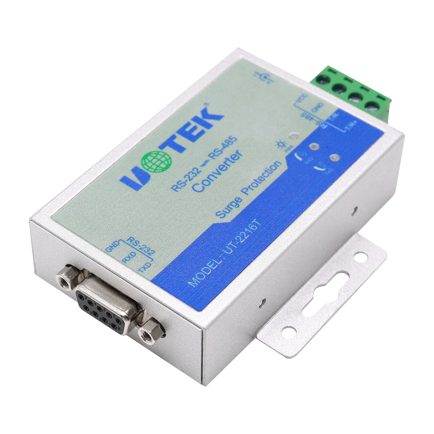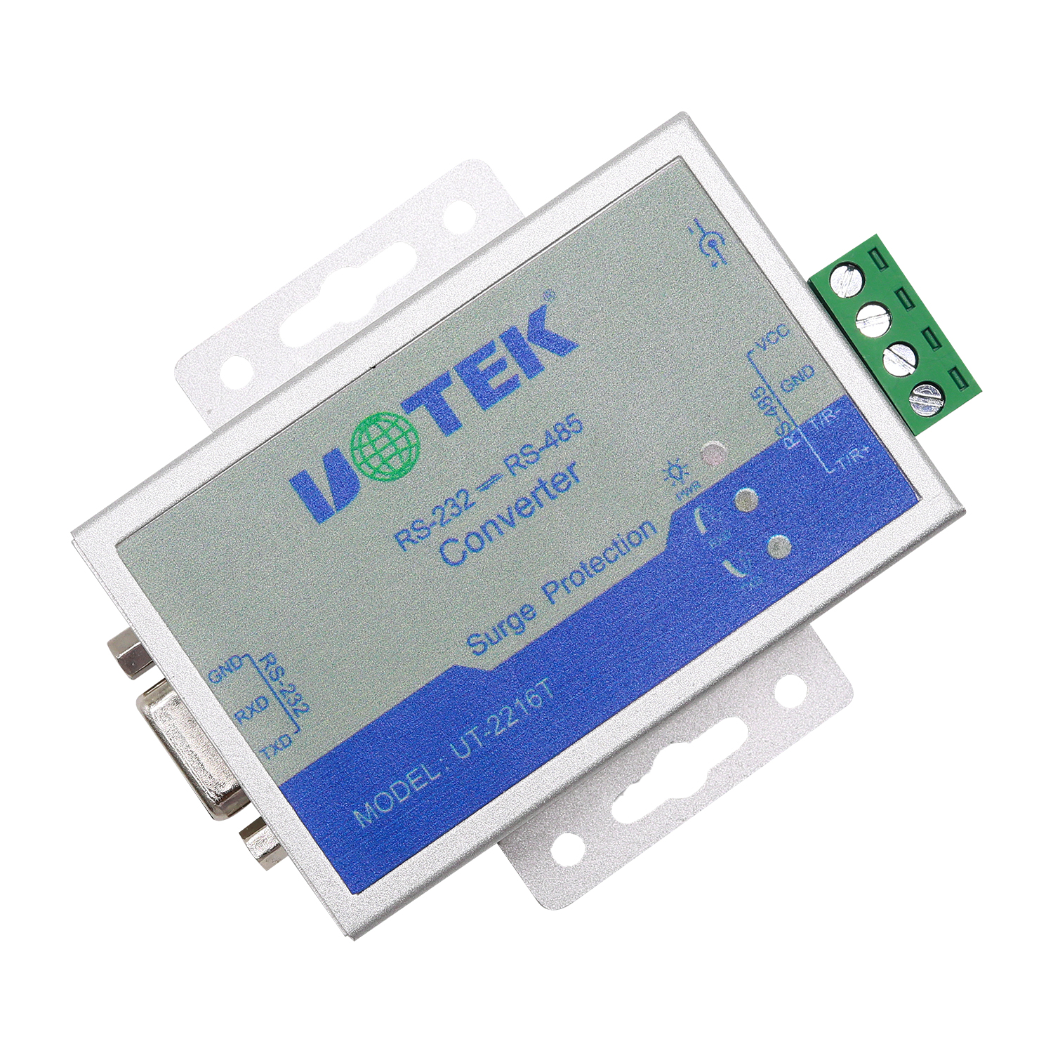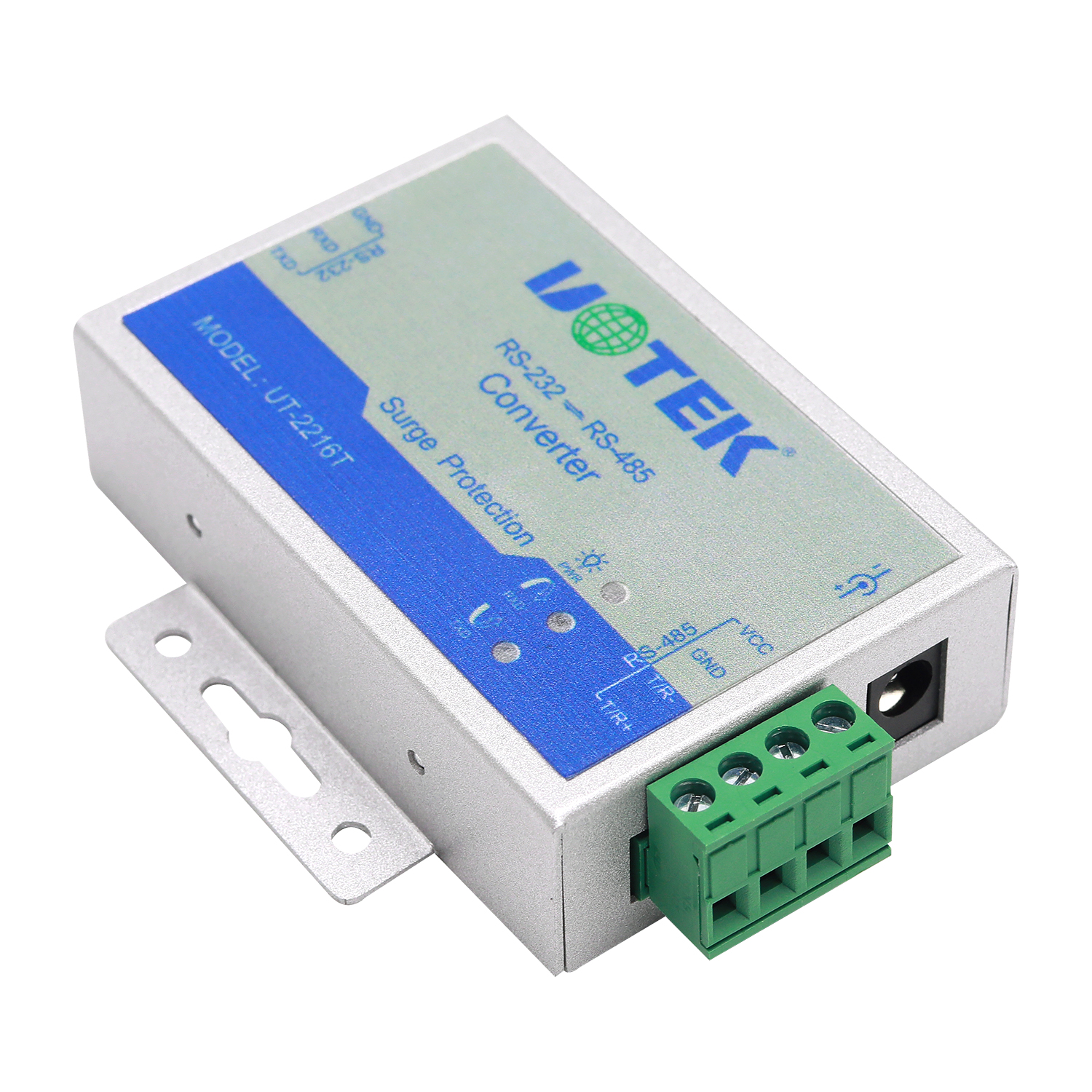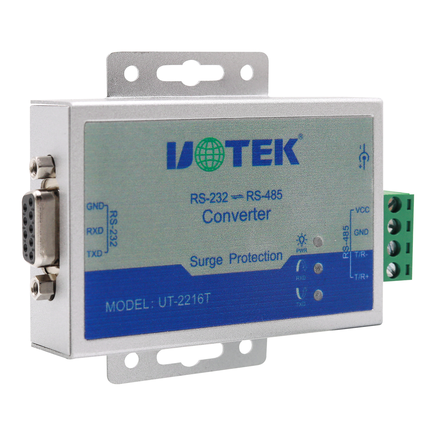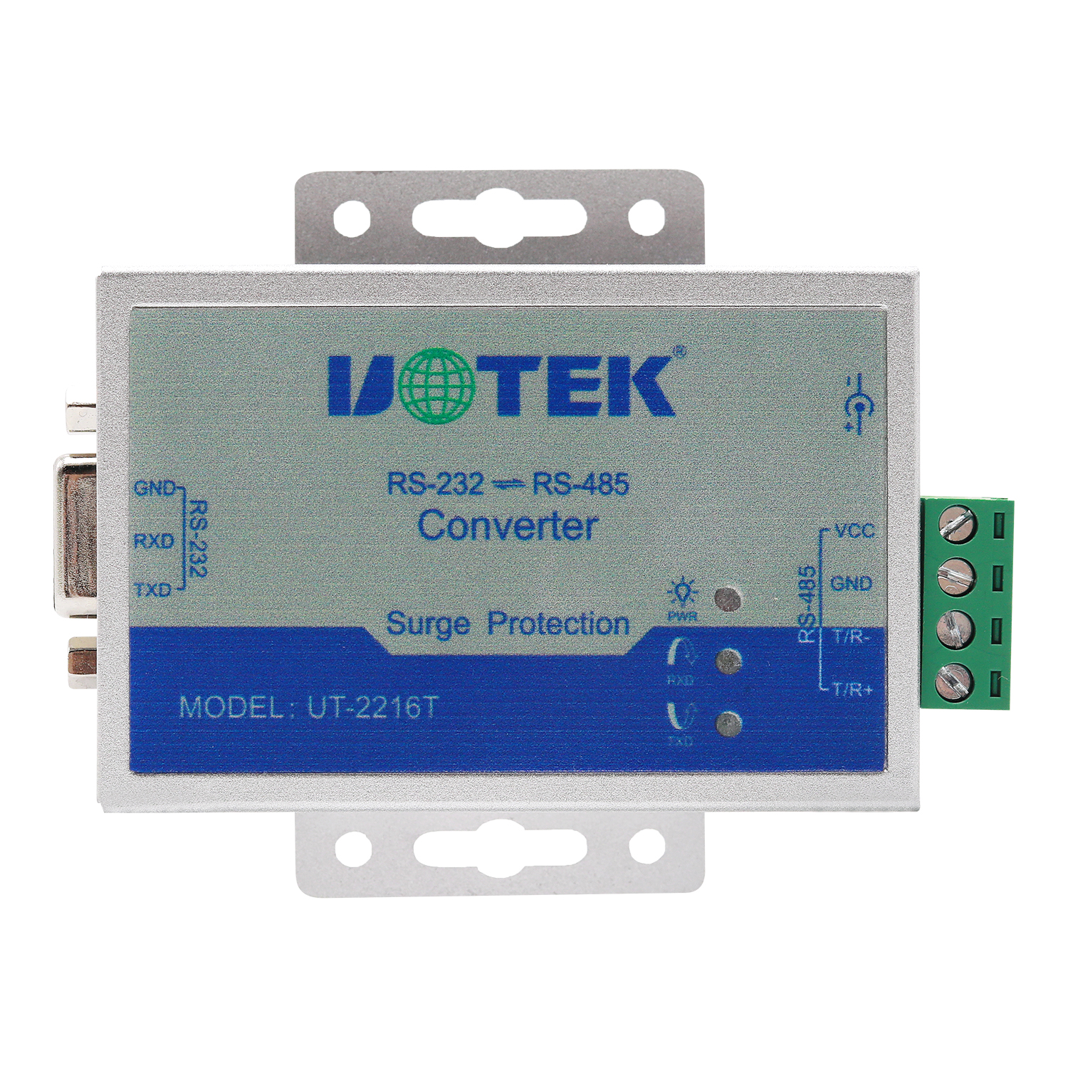 安裝UT-2216T接口轉(zhuǎn)換器前請先仔細(xì)閱讀產(chǎn)品說明書,將RS-232通信電纜、電源(9-24VDC)、RS-485通信電纜分別接入對應(yīng)接口。本產(chǎn)品采用DB9F(或5.08三位接線端子)和5.08四位接線端子,無需跳線設(shè)置自動(dòng)實(shí)現(xiàn)RS-485通信方式,可使用雙絞線或屏蔽線,連接、拆卸非常方便。 TXD代表RS-232發(fā)送數(shù)據(jù),RXD代表接收數(shù)據(jù)。T/R+T/R-代表發(fā)送、接收A+/B-,VCC 代表輸入電源, GND 代表公共地線,支持點(diǎn)到點(diǎn)、點(diǎn)到多點(diǎn)、半雙工通信接兩根線T/R+、T/R-。