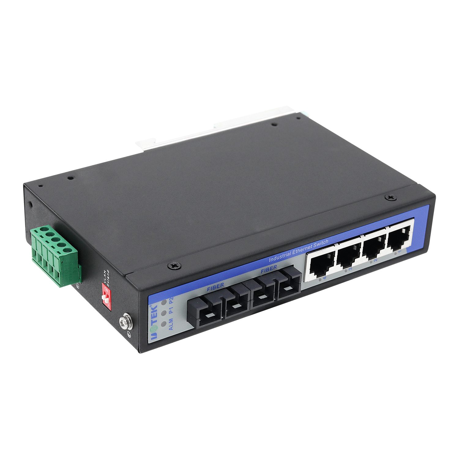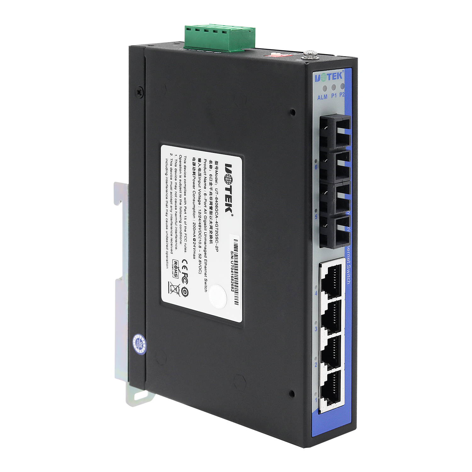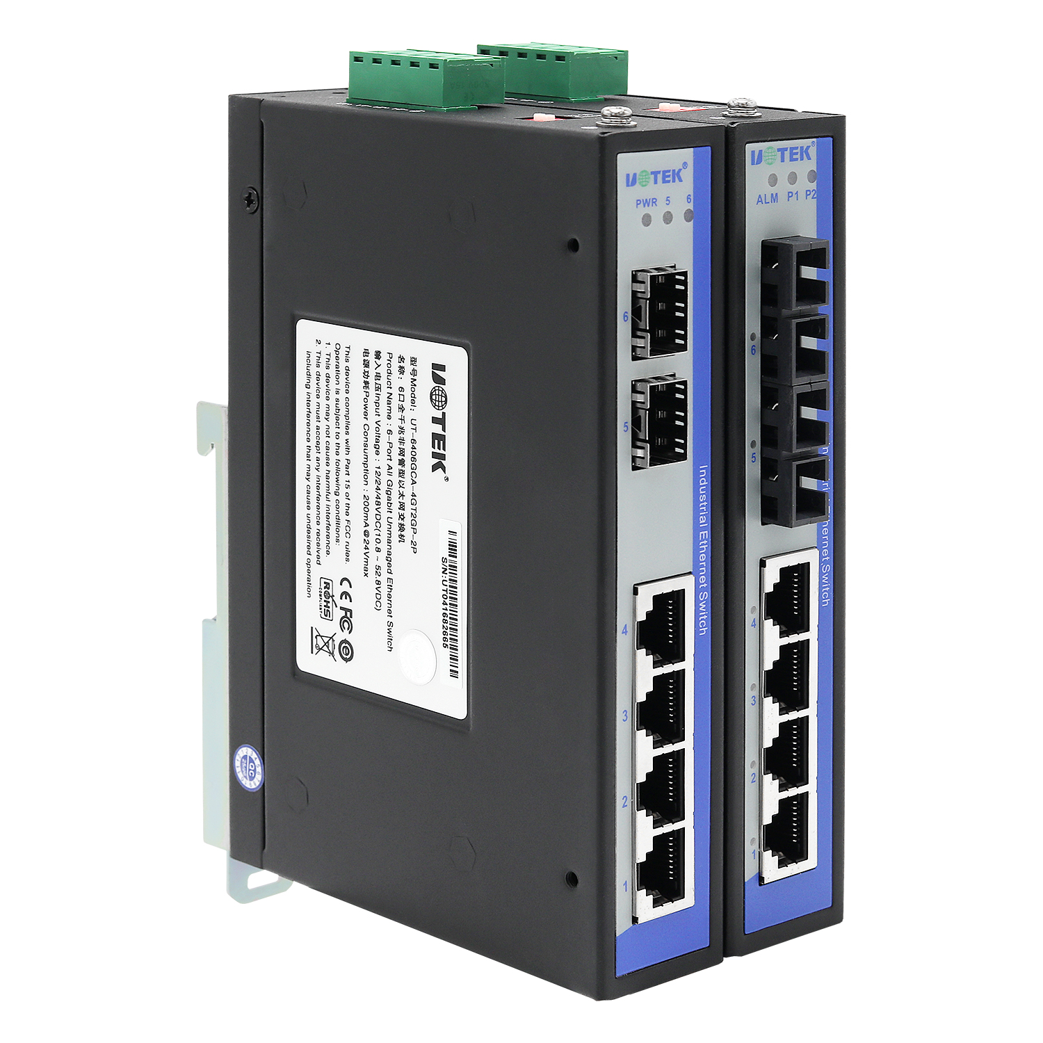 UT-6406GCA系列是非網管型全千兆以太網交換機,支持2路千兆光纖接口和4路千兆以太網端口,即插即用;該系列交換機采用低功耗、無風扇設計,確保無噪聲干擾,同時支持-40~75℃工作溫度和良好的EMC電磁兼容性能,保證在惡劣的工業環境中保持穩定的工作,為工廠自動化,智能交通,視頻監控等工業應用領域組建快速穩定的網絡終端接入網絡提供安全可靠的解決方案,該產品提供3種工作模式:延長、標準和VLAN模式,適應各種復雜的應用環境。